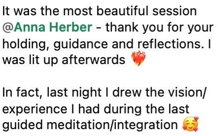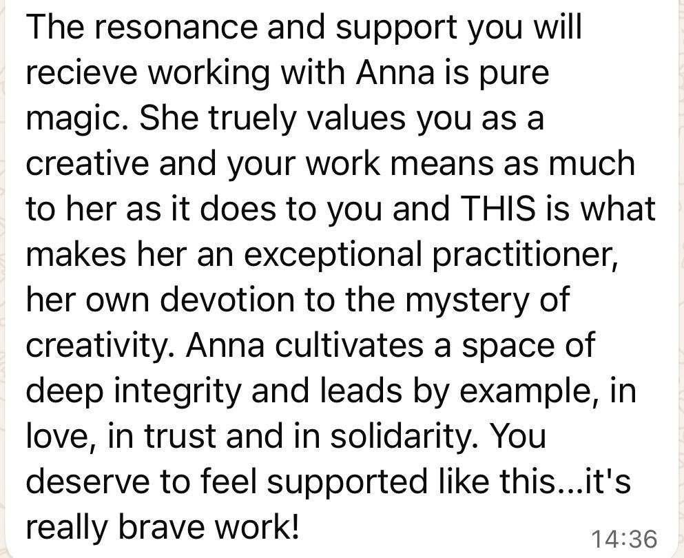“The resonance and support you will receive working with Anna is pure magic. She truly values you as a creative. Your work means as much to her as it does to you and THIS is what makes her an exceptional practitioner, her own devotion to the mystery of creativity. Anna cultivates a space of deep integrity and leads by example, in love, in trust, and in solidarity.”